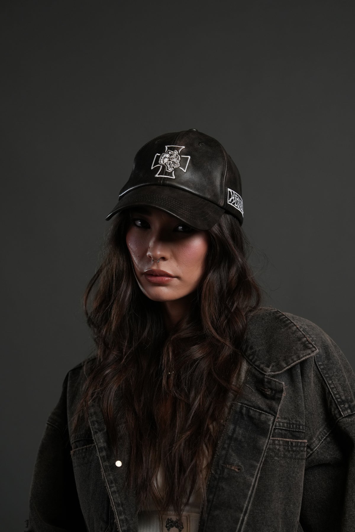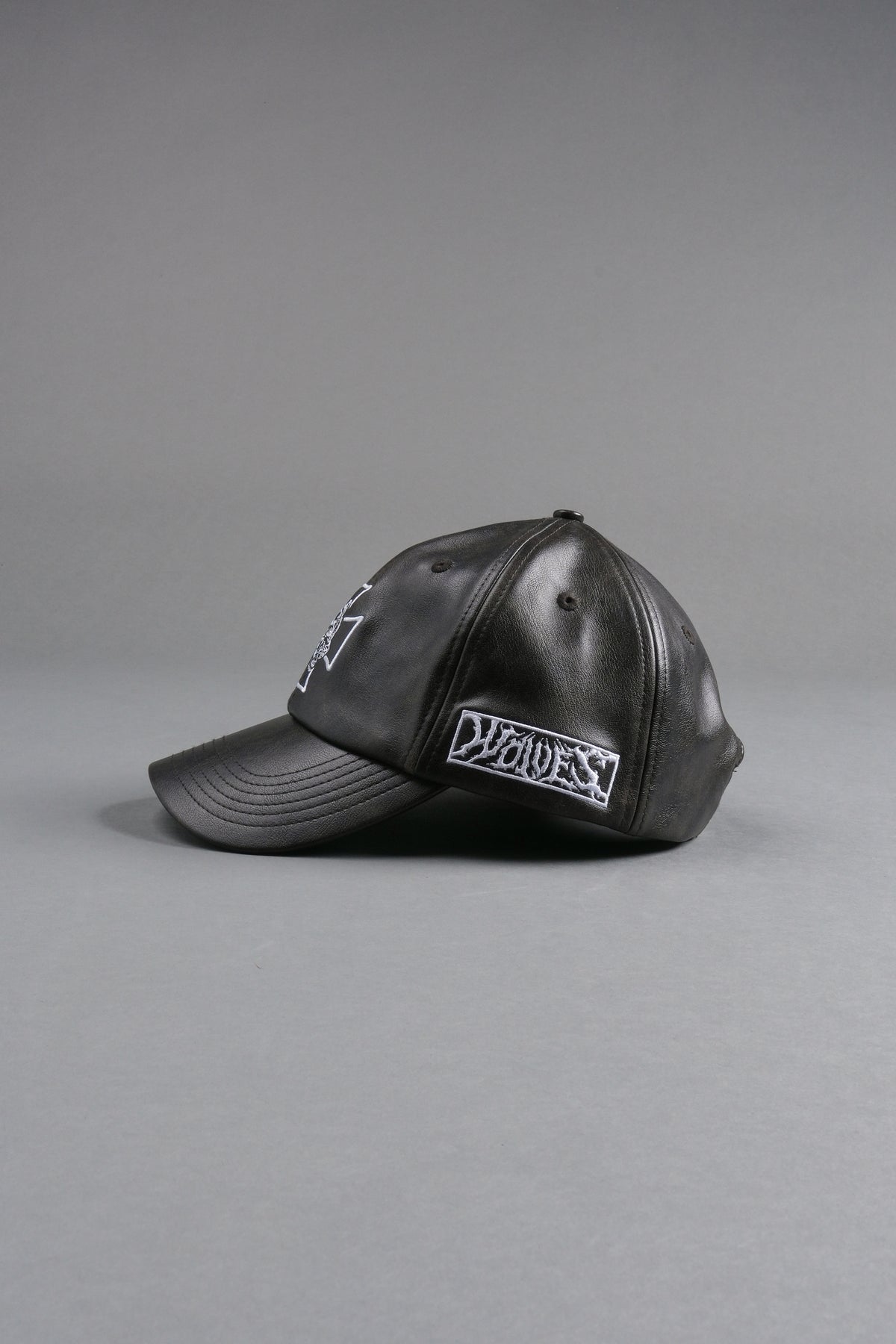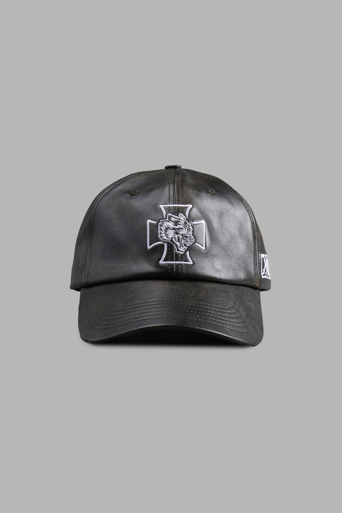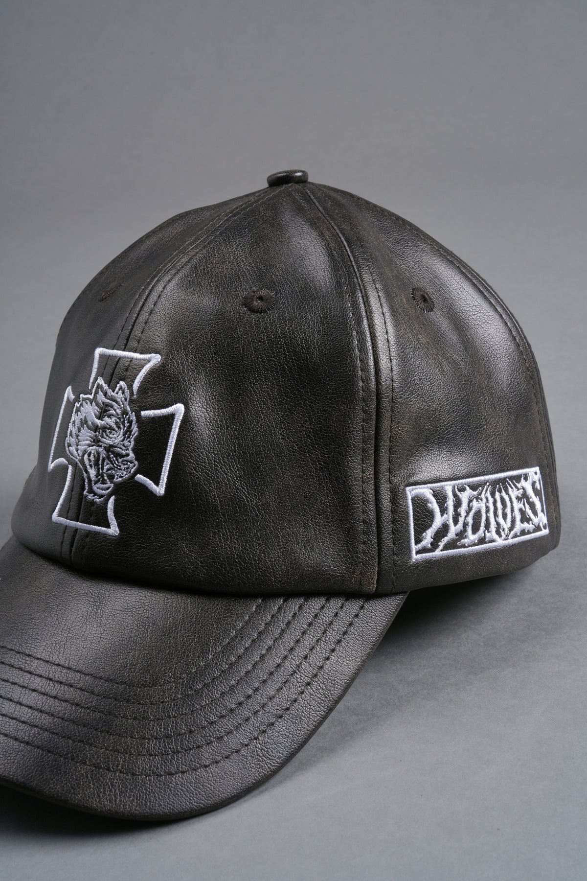 Iron Wolf Head Faux Leather Dad Hat in Black