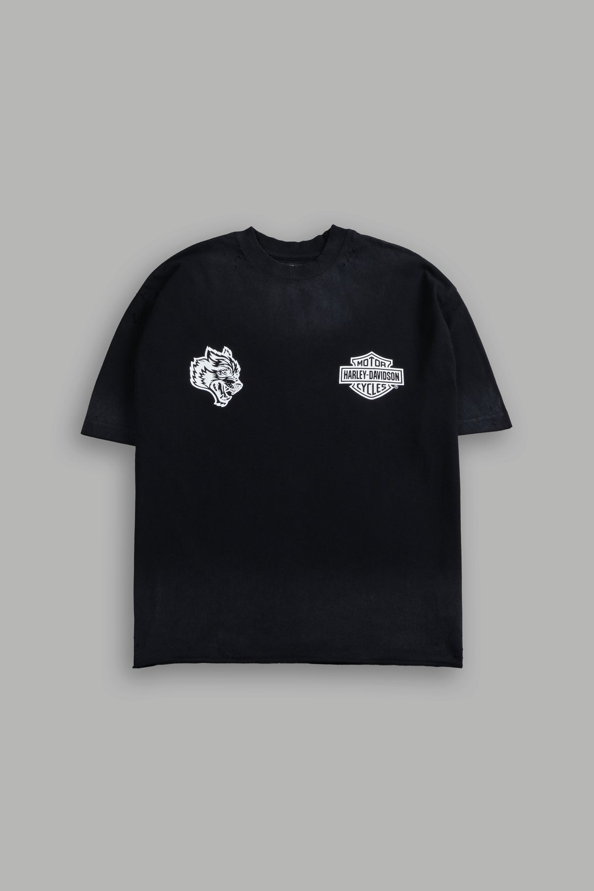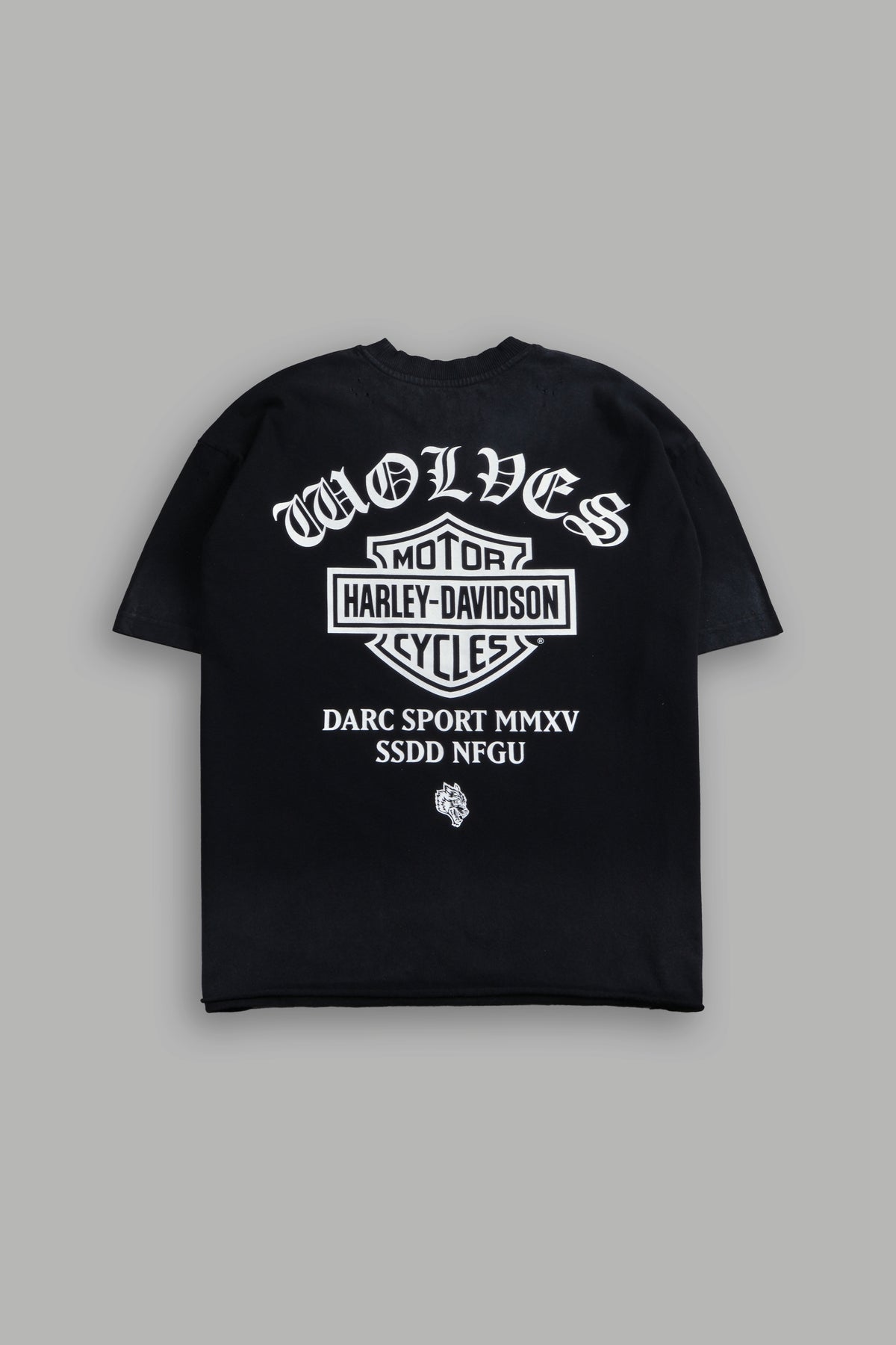 Harley-Davidson Wolves Distressed Grunge Mid-Length Raw Hem Tee in Black Drift Wash