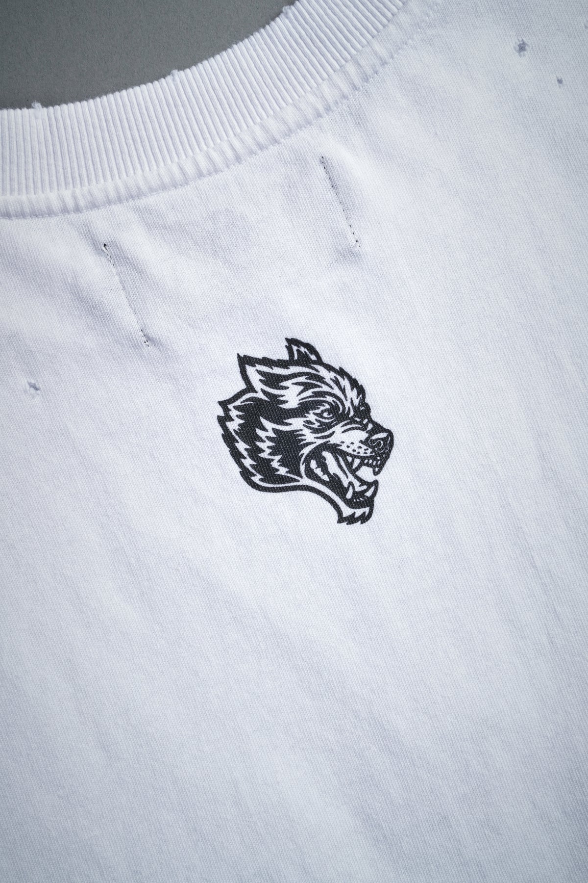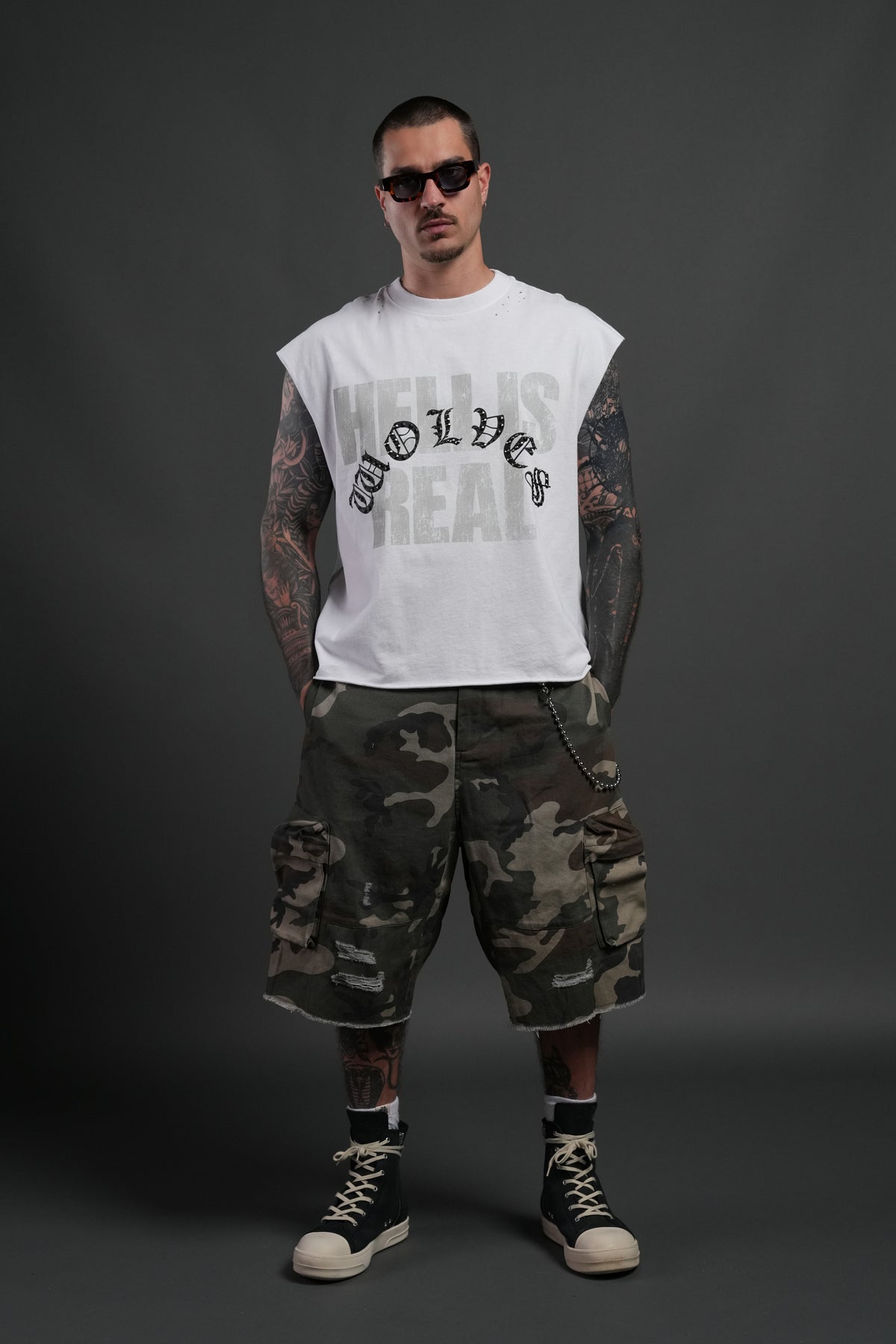 Hell is Real Distressed Grunge Mid-Length Raw Hem Muscle Tee in White