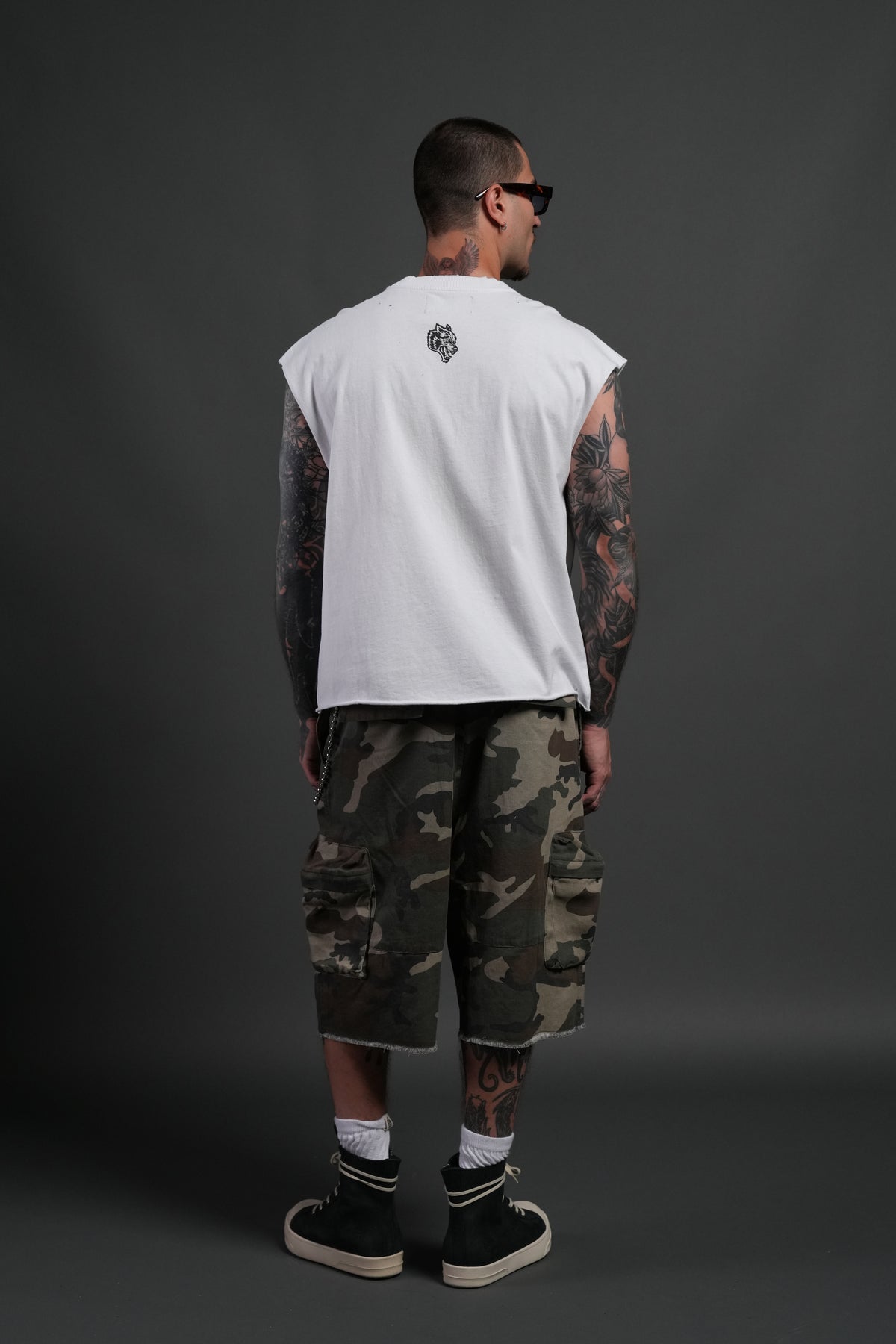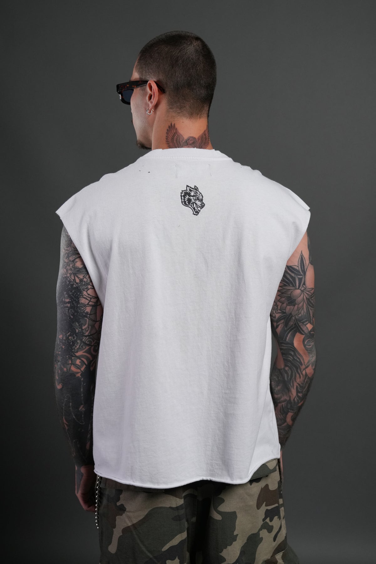 Distressed Grunge Cut Off Mid-Length Raw Hem Muscle Tee