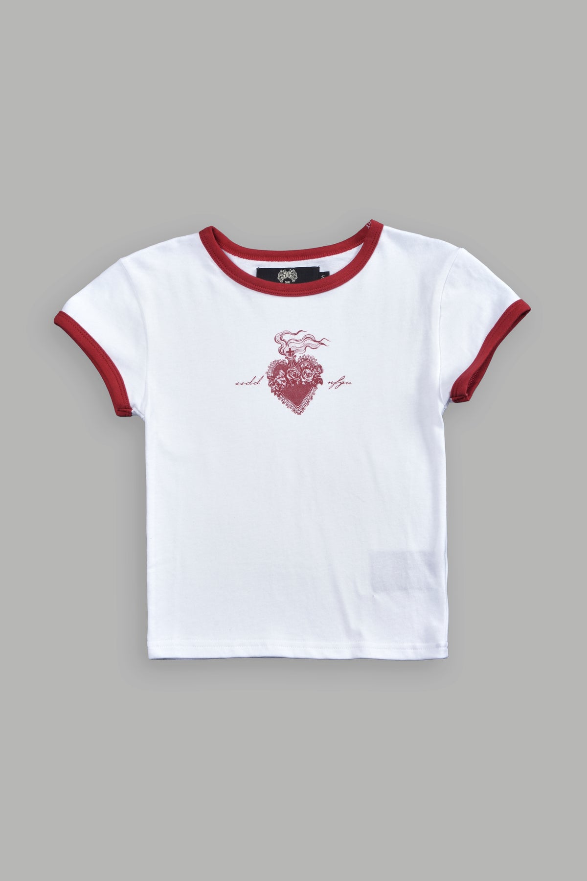 Sacred Flame Ringer "Baby" Tee in White/Roman Red