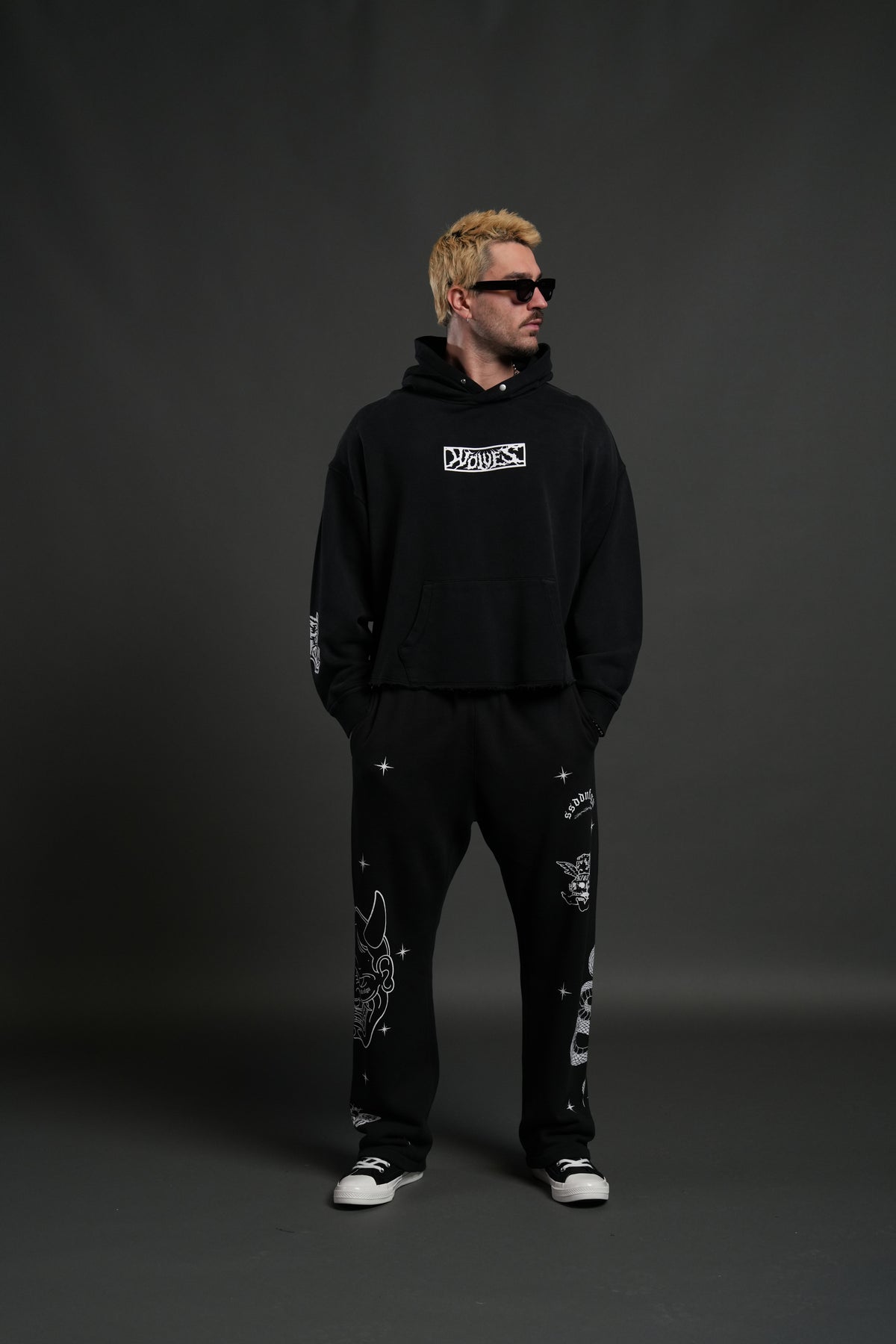 Midnight Wolves Raw Hem "Box Cut" Pierce Hoodie in Black Drift Wash